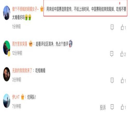 这些网友具体是说:“用来给中国赛造势宣传,不给上场时间,中国赛刚结束就裁掉,吃相不要太难看好吗”“吃相难看”