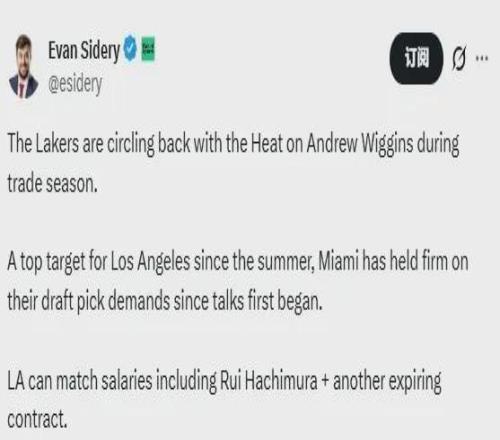 名记Sidery:湖人和热火重启关于维金斯的交易谈判......